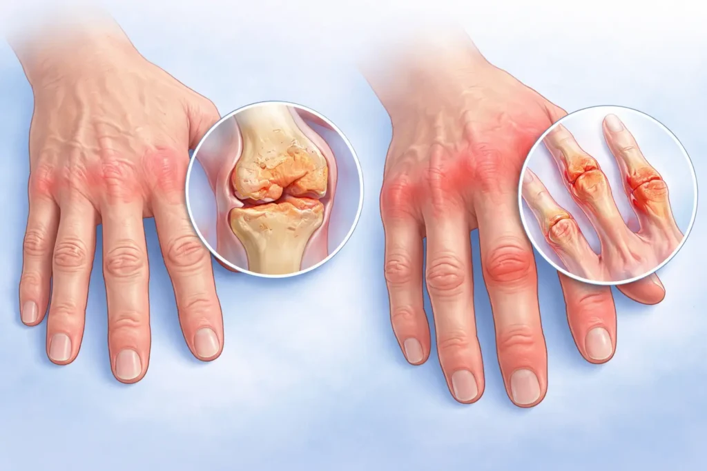 Osteoarthritis and rheumatoid arthritis are both forms of arthritis that cause joint pain and stiffness. Osteoarthritis is a wear‑and‑tear condition driven by joint cartilage breakdown. Rheumatoid arthritis is an autoimmune disease where the immune system attacks joint tissues. They differ in causes, symptoms, progression, and treatment. Introduction: Why This Matters Living with chronic joint pain […]